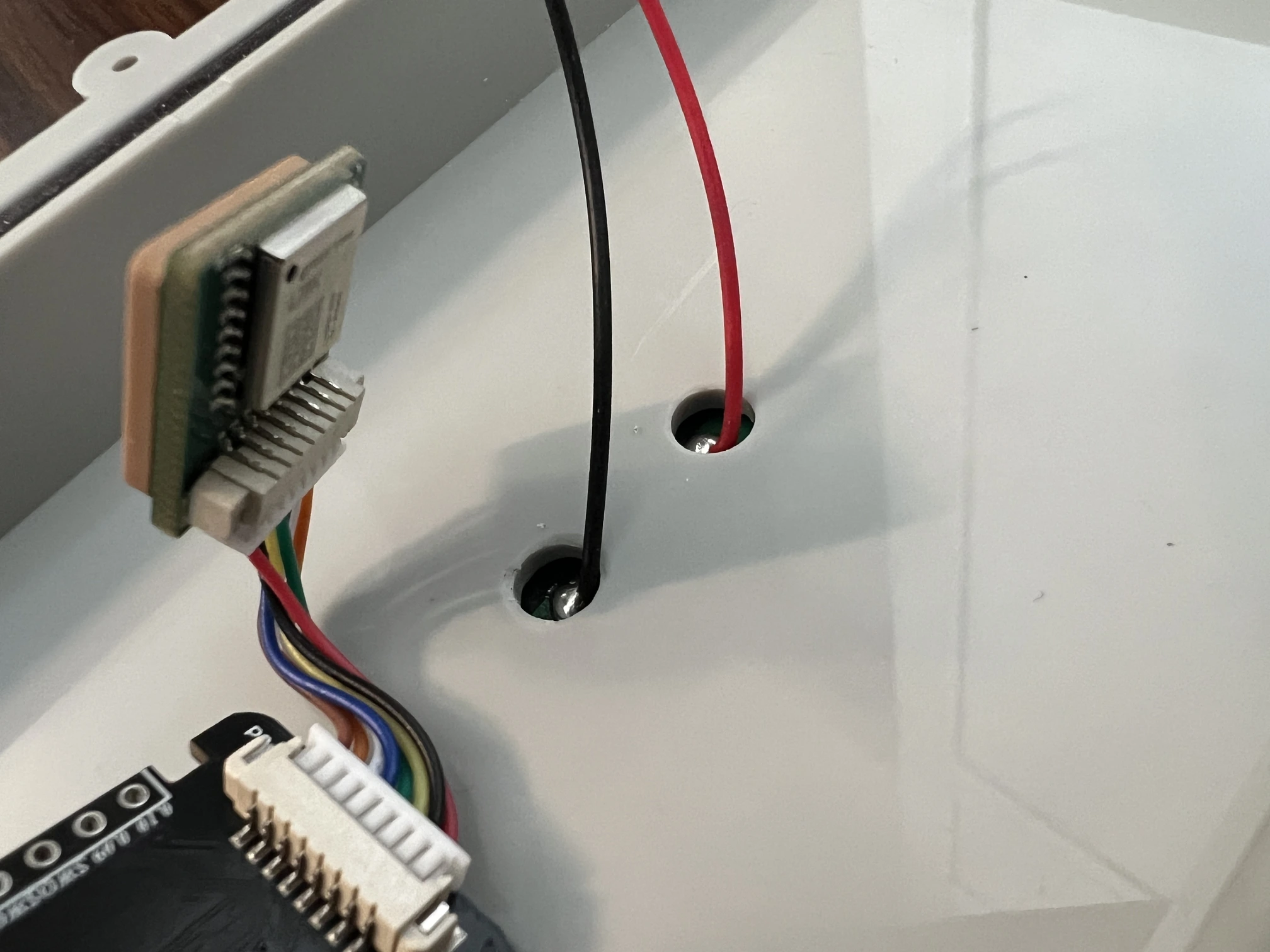 完成焊接后,将太阳能板固定在防水配电箱的盖子上。在盖子表面钻两个孔,孔的直径应稍大于线缆的外径(通常为 3-5 毫米),这样可以方便电线穿过,并保证密封性。线缆穿过后,可以将线材末端焊接到 Heltec T114 的太阳能接口匹配端子上,再将其插入 T114 的太阳能接口,确保正负极无误。